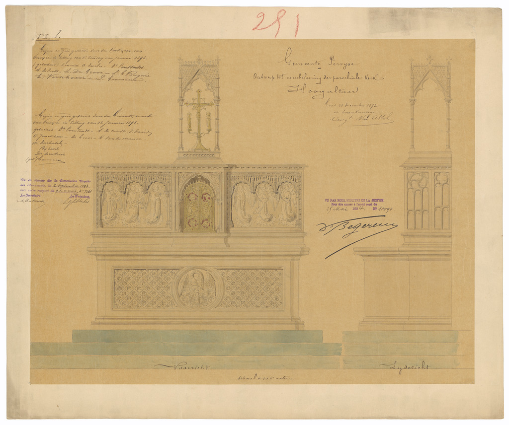 Opschrift: Gemeente Pervijse. Ontwerp tot meubelering der parochiale kerk. Hoogaltaar Omschrijving plan: ontwerp hoogaltaar Datum KCML: 02/09/1893 Archiefnummer: W0475