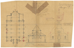 Opschrift: Provincie West-Vlaanderen. Gemeente Stuyvekenskerke. Ontwerp voor de noodige verzekeringswerken alsmede het opmaken der toren, uitttevoeren aan het kerkgebouw. Omschrijving plan: plattegrond, dwarsdoorsnede en opstand voorgevel Datum KCML: 28/06/1890 Archiefnummer: W0491