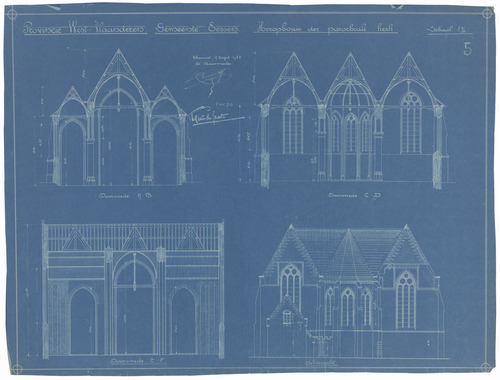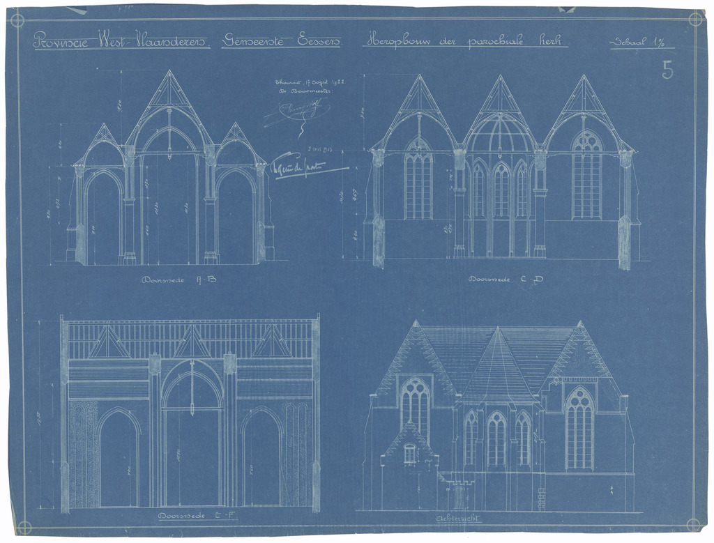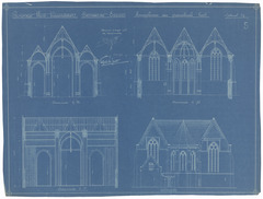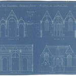 Opschrift: Provincie West-Vlaanderen. Gemeente Eessen. Heropbouw der parochiale Kerk. Omschrijving plan: opstand achtergevel en doorsneden Datum KCML: deze informatie wordt niet vermeld op het archiefstuk Archiefnummer: W0429