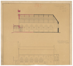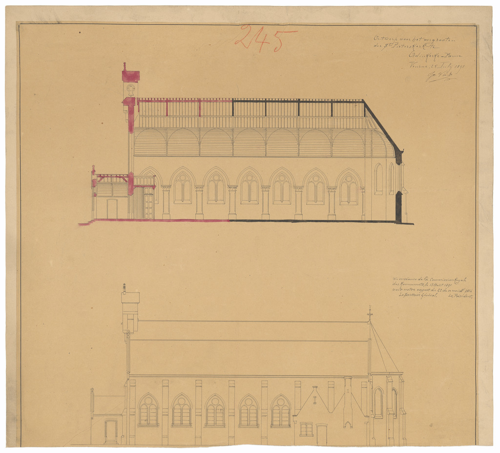 Opschrift: Ontwerp voor het vergrooten der St. Pieterskerk te Adinkerke-Panne Omschrijving plan: opstand zijgevel en langsdoorsnede Datum KCML: 13/08/1891 Archiefnummer: W0403