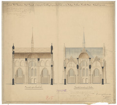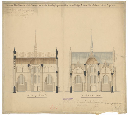 Opschrift: Provincie West-Vlaanderen. Stad Dixmude. Ontwerp tot herstelling der parochiale kerk vanden Heiligen Niklaas. Omschrijving plan: dwarsdoorsnede Datum KCML: 10/11/1888 Archiefnummer: W0413