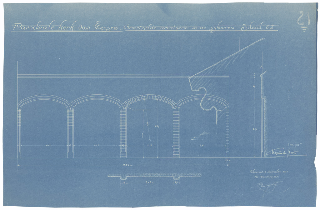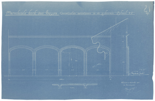 Opschrift: Parochiale kerk van Eessen. Gemetselde arcaturen in de zijkooren. Omschrijving plan: ontwerp steunbogen zijkoren Datum KCML: deze informatie wordt niet vermeld op het archiefstuk Archiefnummer: W0445