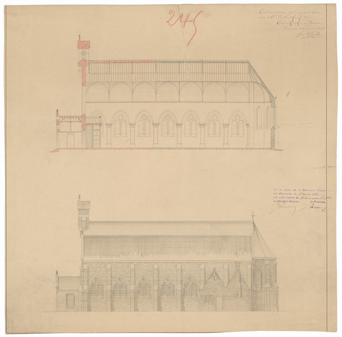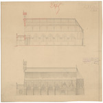 Opschrift: Ontwerp voor het vergrooten der St.Pieterskerk te Adinkerke-Panne Omschrijving plan: opstand zijgevel en langsdoorsnede Datum KCML: 13/08/1891 Archiefnummer: W0402