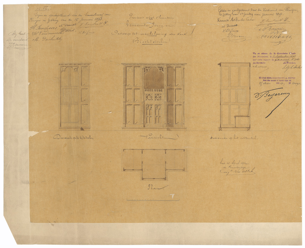 Opschrift: Provincie West-Vlaanderen. Gemeente Pervijse. Ontwerp tot meubeleering der Kerk. Biechtstoelen Omschrijving plan: ontwerp biechtstoelen Datum KCML: 02/09/1893 Archiefnummer: W0481