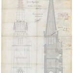 Opschrift: Provincie West-Vlaanderen. Gemeente Stuyvekenskerke. Herstelling van den ouden kerktoren. Omschrijving plan: opstand en doorsnede toren Datum KCML: 09/09/1899 Archiefnummer: W0493