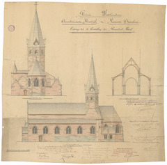 Opschrift: Provincie Westvlaanderen. Arrondissement Kortrijk. Gemeente Bavichove. Ontwerp tot de herstelling der Parochiale Kerk. Omschrijving plan: opstand achter- en zijgevel, dwarsdoorsnede Datum KCML: 30/04/1898 Archiefnummer: W0527