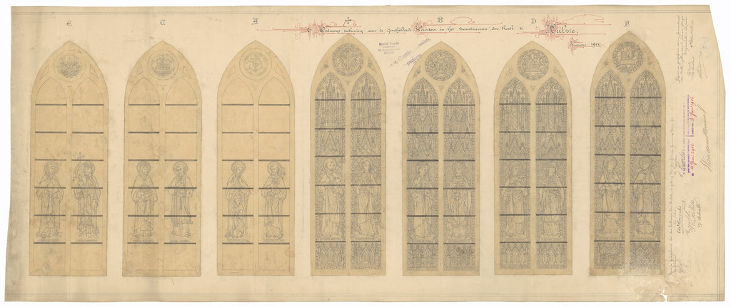 Opschrift: Ontwerp teekening voor de geschilderde Vensters in het sanctuarium der kerk te Hulste Omschrijving plan: ontwerp glasramen Datum KCML: deze informatie wordt niet vermeld op het archiefstuk Archiefnummer: W0541