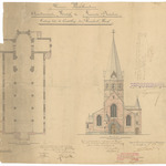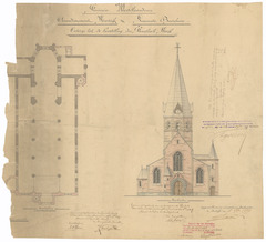 Opschrift: Provincie Westvlaanderen. Arrondissement Kortrijk. Gemeente Bavichove. Ontwerp tot de herstelling der Parochiale Kerk. Omschrijving plan: plattegrond, opstand voorgevel Datum KCML: 30/04/1898 Archiefnummer: W0526