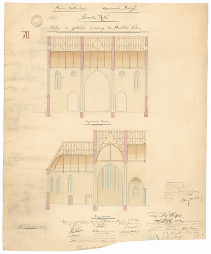 Opschrift: Provincie Westvlaanderen. Arrondissement Kortrijk. Gemeente Hulste. Ontwerp tot gedeeltelijke vernieuwing der Parochiale Kerk. Omschrijving plan: langsdoorsnede Datum KCML: 6-6-1903 Archiefnummer: W0534