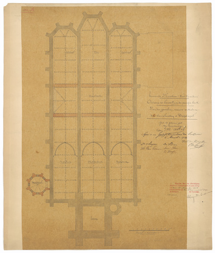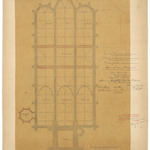 Opschrift: Gemeente Merckem - West-Vlaanderen. Ontwerp tot herstelling der parochie Kerk. Plan der gewelven, nieuwe arkaden der kruisbeuken & Doopkapel. Omschrijving plan: plattegrond niveau 0 Datum KCML: 12/11/1904 Archiefnummer: W0574