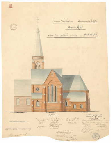 Opschrift: Provincie Westvlaanderen. Arrondissement Kortrijk. Gemeente Hulste. Ontwerp tot gedeeltelijke vernieuwing der Parochiale Kerk. Omschrijving plan: opstand Z-gevel Datum KCML: 6-6-1903 Archiefnummer: W0530