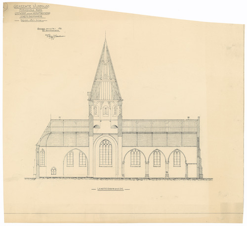 Opschrift: Gemeente Vladsloo. Parochiale kerk. Ontwerp voor heropbouwing. Omschrijving plan: langsdoorsnede Datum KCML: deze informatie wordt niet vermeld op het archiefstuk Archiefnummer: W0504