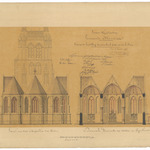 Opschrift: Provincie West-Vlaanderen. Gemeente Merckem. Ontwerp tot herstelling der parochiale kerk van den H. Bavo Omschrijving plan: opstand O-gevel (koor en kapellen) en dwarsdoorsnede Datum KCML: 14/04/1900 Archiefnummer: W0573