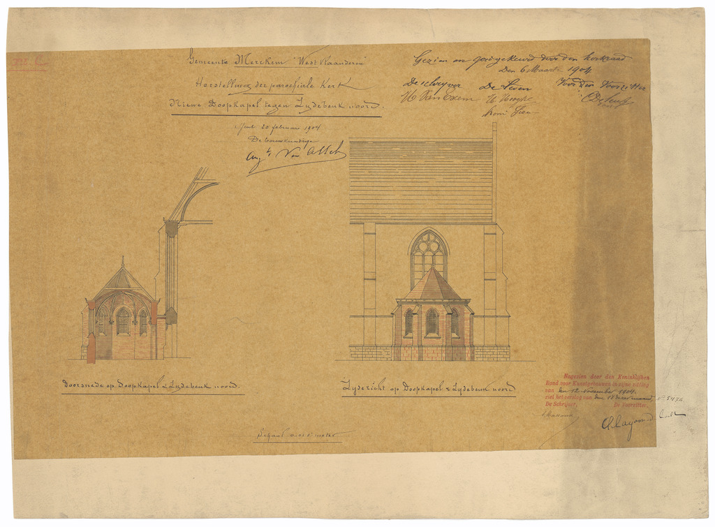 Opschrift: Gemeente Merckem - West-Vlaanderen. Herstelling der parochiale kerk. Niewe Doopkapel tegen Zuidebeuk noord. Omschrijving plan: doorsnede op doopkapel en zijzicht op doopkapel en zijbeuk noord Datum KCML: 12/11/1904 Archiefnummer: W0578