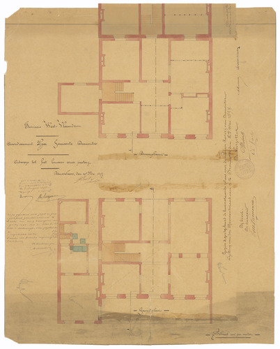 Drager: papier Techniek: pen, opgehoogd met aquarel, aanpassing op kalk opgekleefd Afmetingen (h x b in mm): 670 x 548 mm Schaal: 1/50