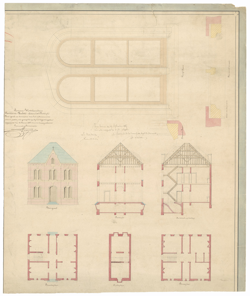 Opschrift: Provincie Westvlaenderen. Gemeente Hulste. Arrondissement Kortrijk. Plans, gevels en doorsneden voor het opbouwen eener nieuwe pastorij Omschrijving plan: ontwerp pastorie Datum KCML: 21/09/1865 Archiefnummer: W0543