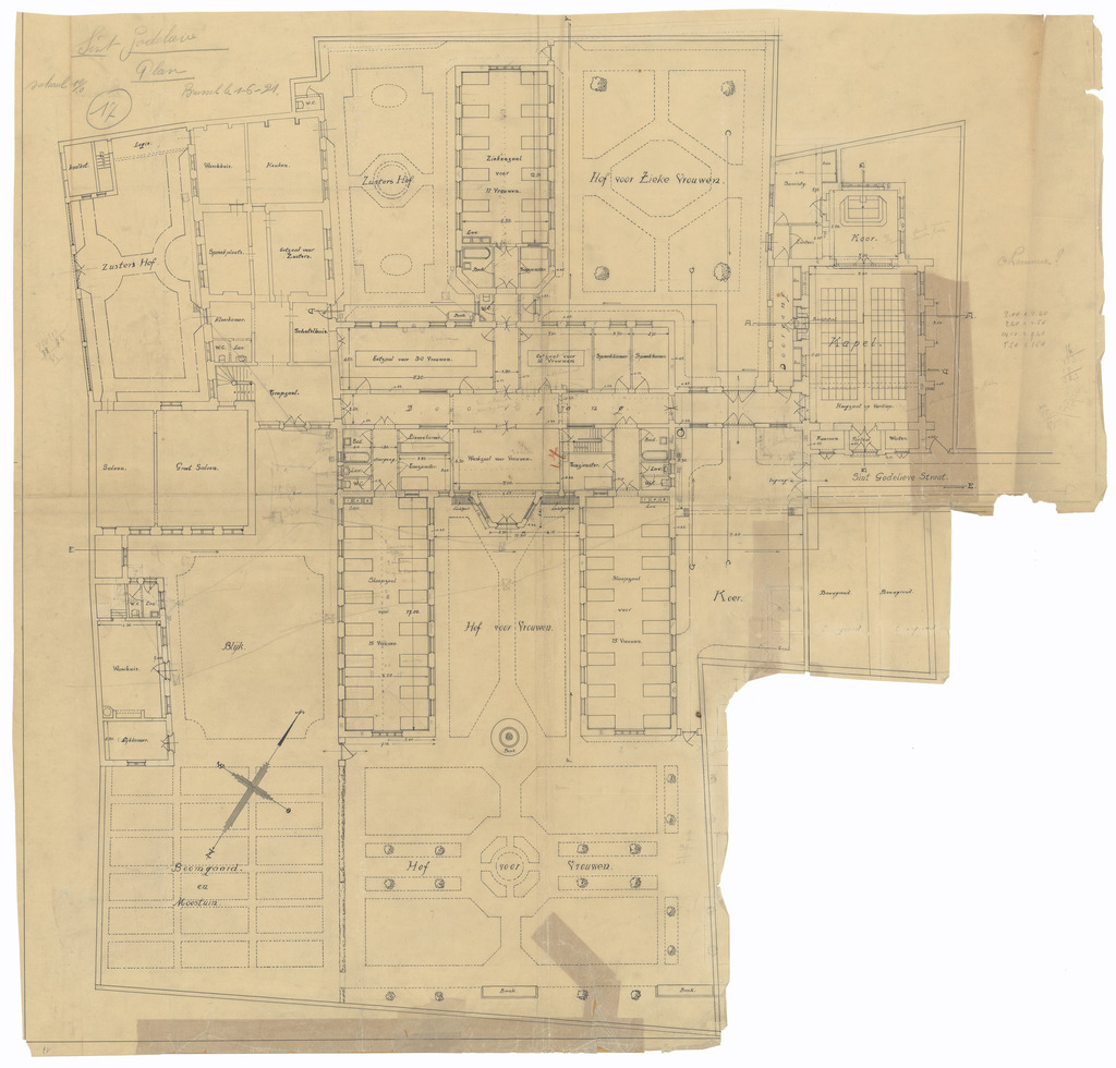Opschrift: Sint Godelieve Omschrijving plan: plattegrond niveau 0 Datum KCML: deze informatie wordt niet vermeld op het archiefstuk Archiefnummer: W0625