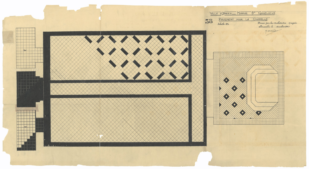 Opschrift: Ville d'Ypres. Hospice Ste Godelieve. Pavement pour la chapelle. Omschrijving plan: betegeling van de kapel Datum KCML: deze informatie wordt niet vermeld op het archiefstuk Archiefnummer: W0645