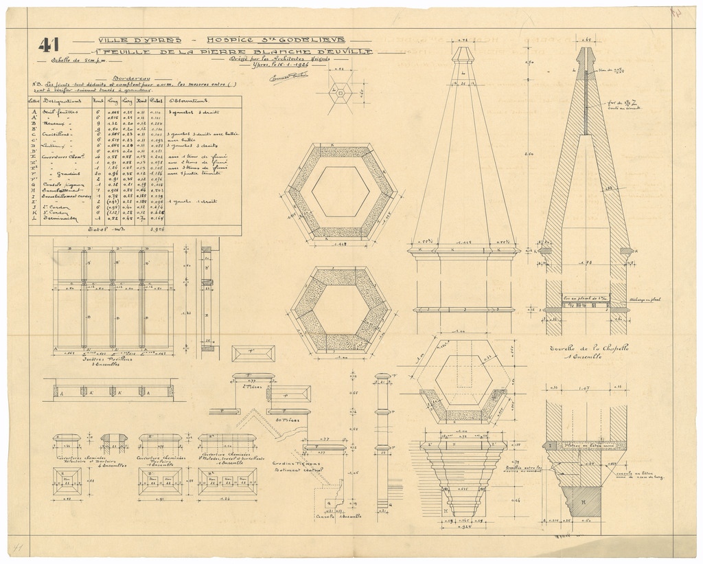 Opschrift: Ville d'Ypres. Hospice Ste Godelieve. 1e feuille de la pierre blanche d'euville Omschrijving plan: berekening zandsteen Datum KCML: deze informatie wordt niet vermeld op het archiefstuk Archiefnummer: W0648
