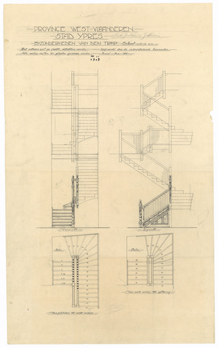 Opschrift: Provincie West Vlaanderen. Stad Yperen. Sint Godelieve Godshuis. Bijzonderheden van den trap Omschrijving plan: ontwerp trap Datum KCML: deze informatie wordt niet vermeld op het archiefstuk Archiefnummer: W0642