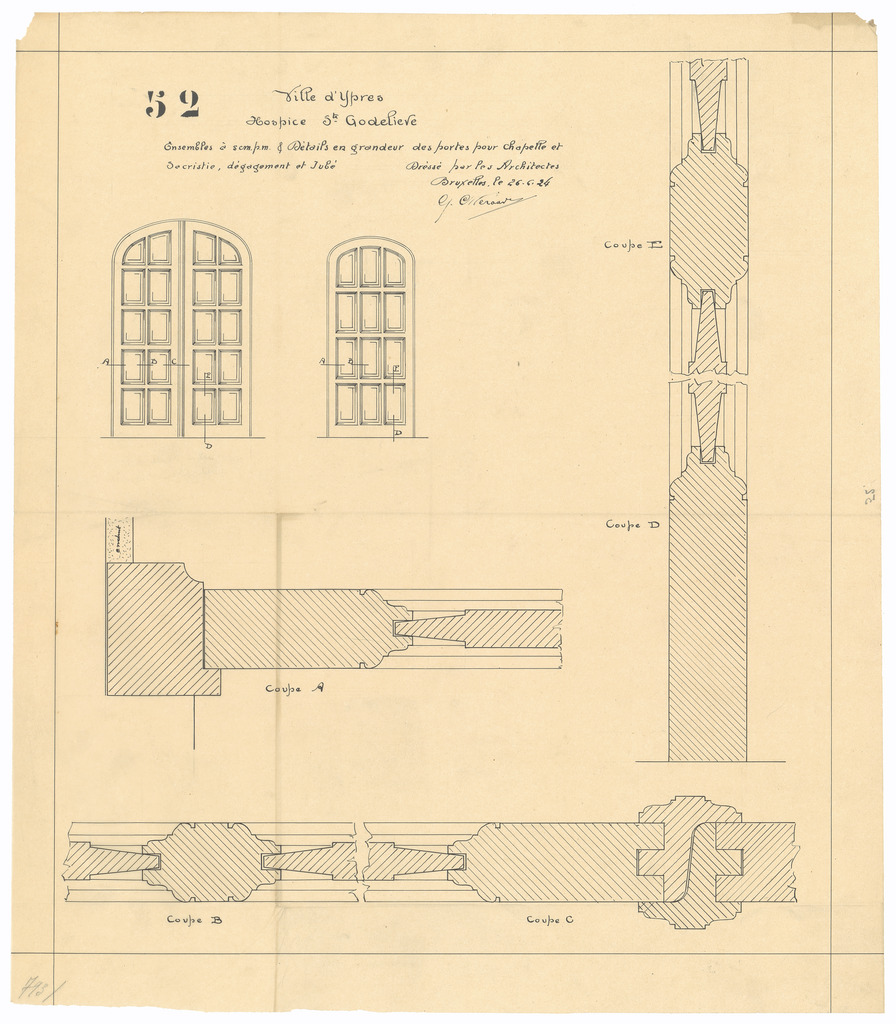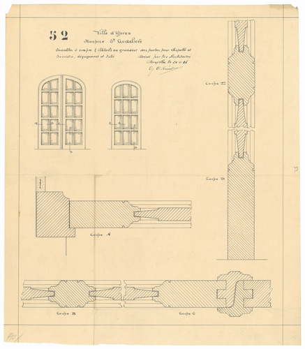 Opschrift: Ville d'Ypres, Hospice Sainte Godelieve. Omschrijving plan: ontwerp deuren Datum KCML: deze informatie wordt niet vermeld op het archiefstuk Archiefnummer: W0656
