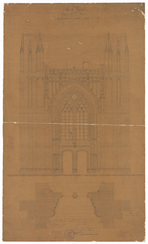 Opschrift: Ville d'Ypres. Flandre Occidentale. Eglise St. Martin. Restauration du portail principal. Omschrijving plan: plattegrond en opstand voorgevel hoofdportaal Datum KCML: 15/10/1887 Archiefnummer: W0663