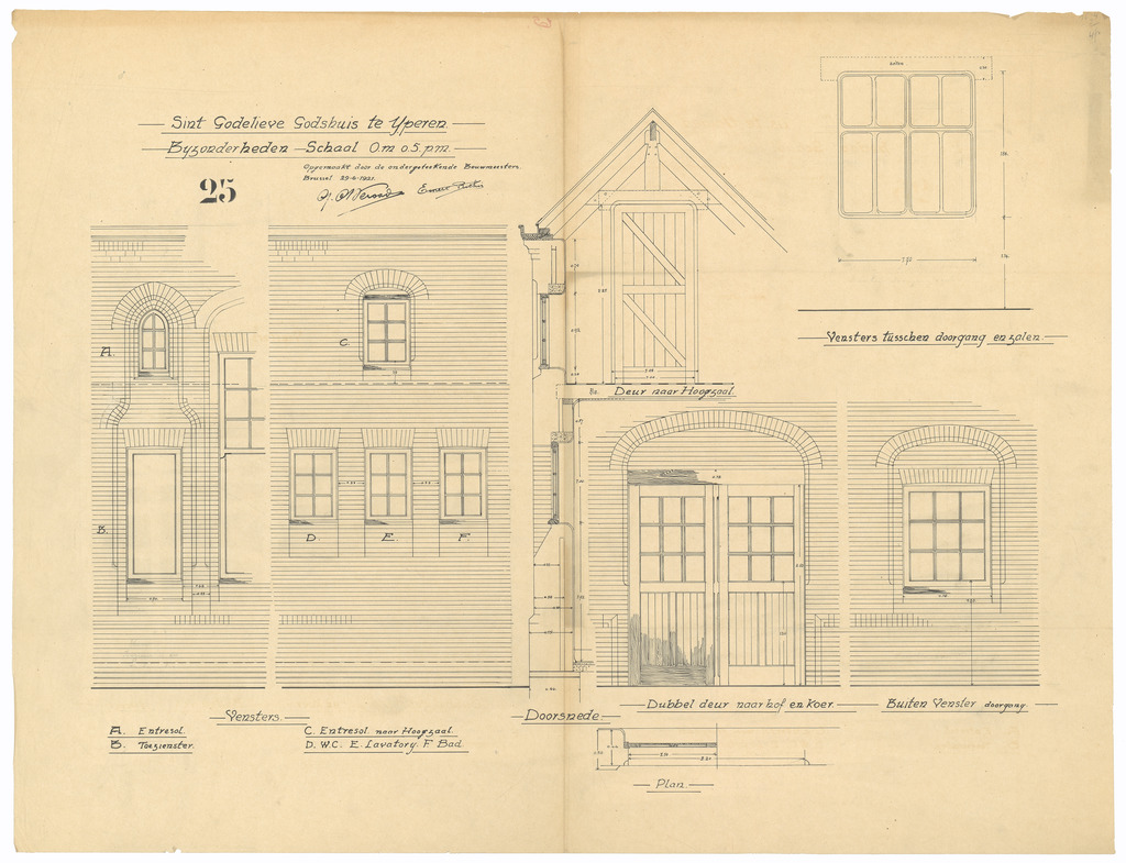 Opschrift: Sint Godelieve Godshuis te Yperen. Bijzonderheden Omschrijving plan: detailtekeningen deuren en ramen Datum KCML: deze informatie wordt niet vermeld op het archiefstuk Archiefnummer: W0633