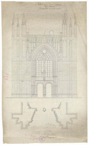 Opschrift: Ville d'Ypres. Flandre Occidentale. Eglise St. Martin. Restauration du portail principal. Omschrijving plan: plattegrond en opstand voorgevel hoofdportaal Datum KCML: 15/10/1887 Archiefnummer: W0664
