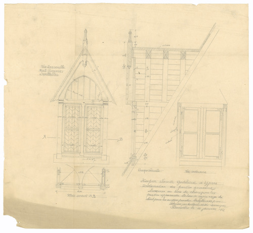 Opschrift: Hospice Sainte Godelieve à Ypres. Restauration des parties anciennes. Omschrijving plan: ontwerp luiken Datum KCML: deze informatie wordt niet vermeld op het archiefstuk Archiefnummer: W0620