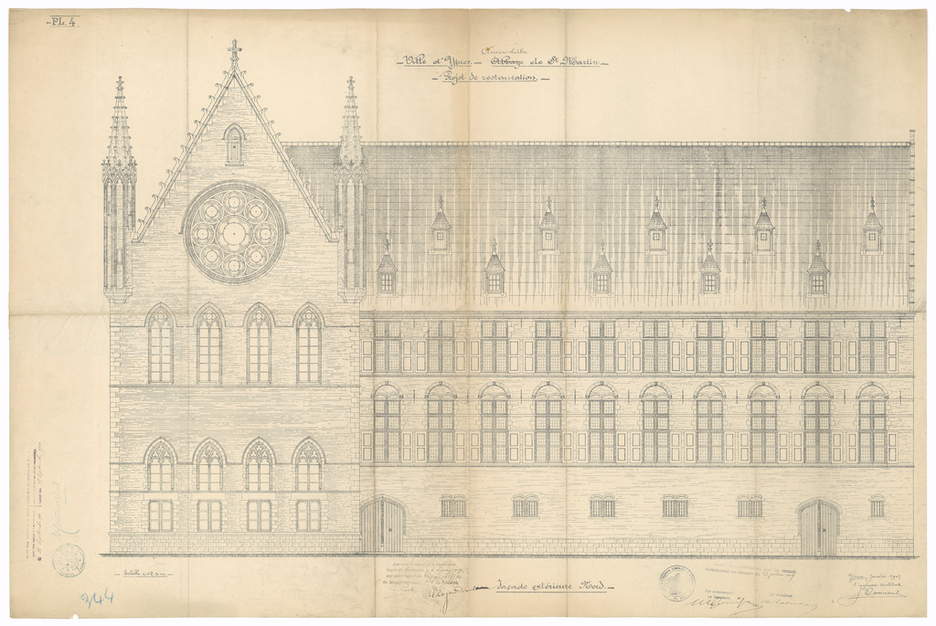 Opschrift: Ville d'Ypres. Ancien cloïtre de St. Martin. Projet de restauration. Omschrijving plan: opstand N-gevel Datum KCML: 3-7-1909 Archiefnummer: W0669