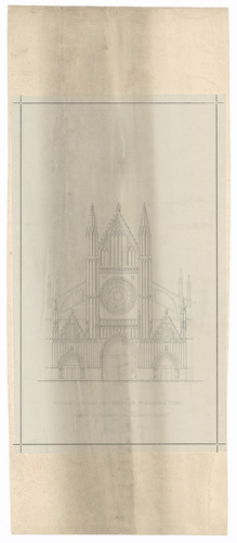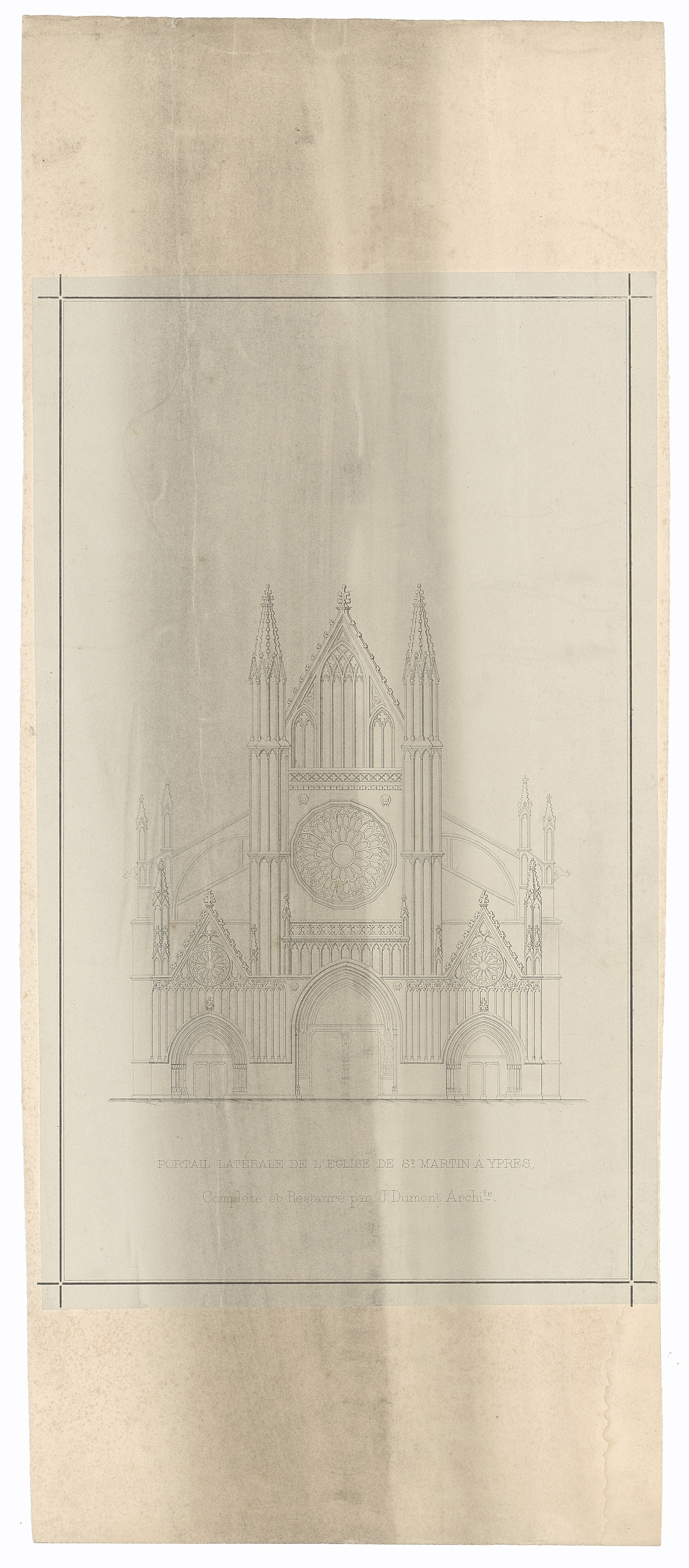 Opschrift: Portail latérale de l'Eglise de St. Martin à Ypres. Completé en restauré par J.Dumont Architecte. Omschrijving plan: opstand voorgevel, aanduiding zijportaal Datum KCML: deze informatie wordt niet vermeld op het archiefstuk Archiefnummer: W0692