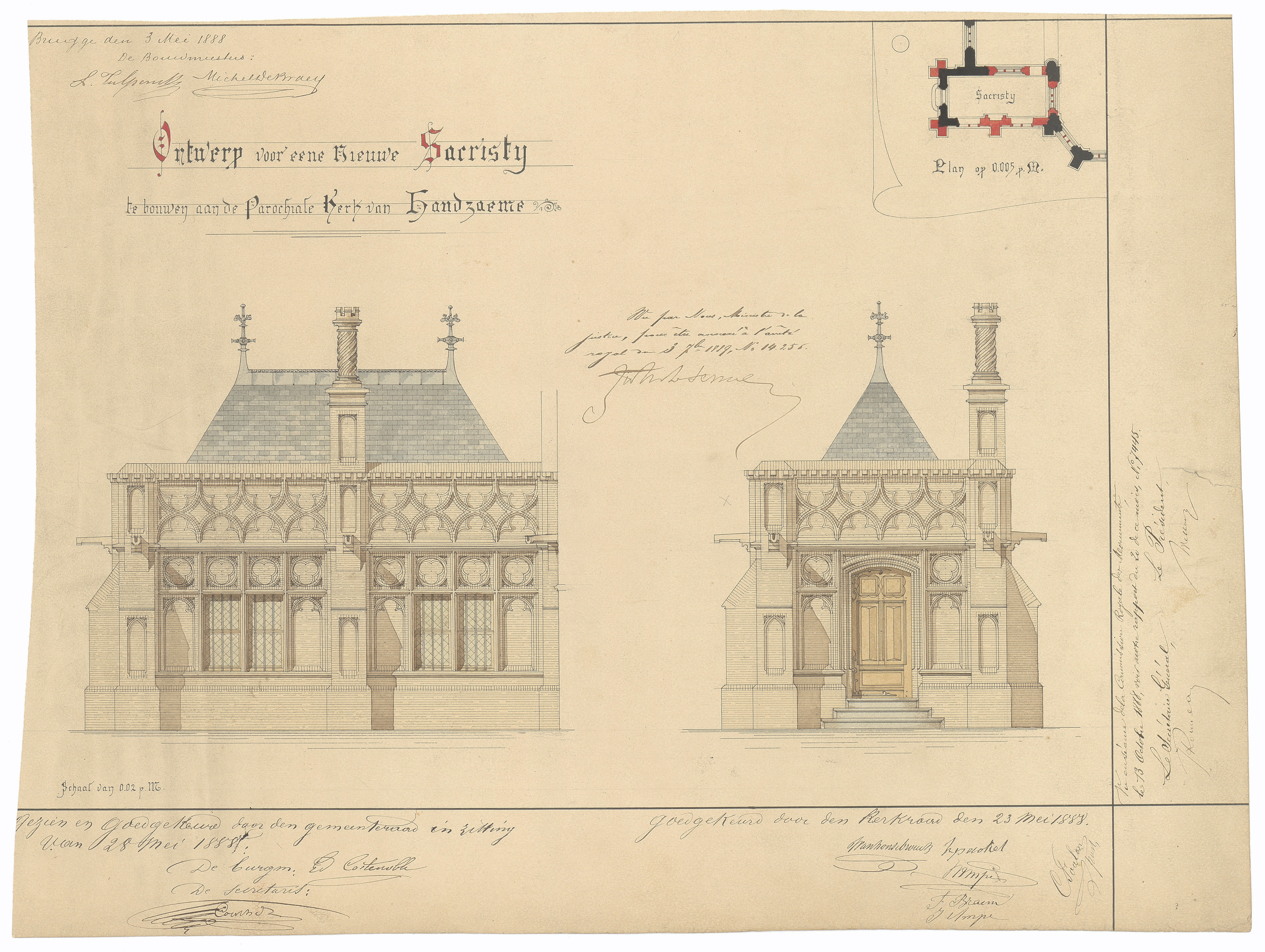 Opschrift: Ontwerp voor eene nieuwe Sacristij te bouwen aan de parochiale kerk van Handzaeme Omschrijving plan: opstand voor- en zijgevel sacristie Datum KCML: 13/10/1888 Archiefnummer: W0994