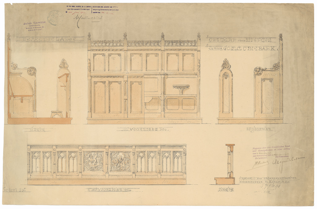 Opschrift: Gemeente Zande. Ontwerp voor zittens en voor communiebank Omschrijving plan: ontwerp gestoelte en communiebank Datum KCML: 2-12-1911 Archiefnummer: W0952