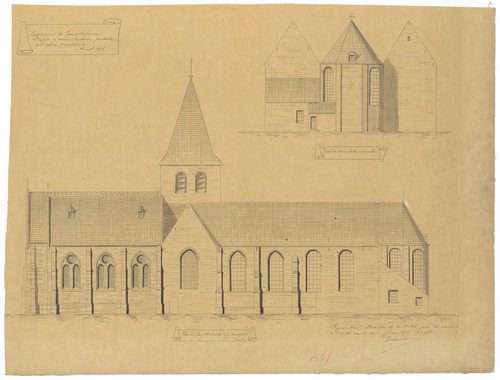 Opschrift: Commune de Couckelaere. Projet de reconstruction partielle de l'Eglise paroissiale. Omschrijving plan: opstand Z-gevel Datum KCML: deze informatie wordt niet vermeld op het archiefstuk Archiefnummer: W0922