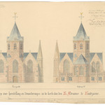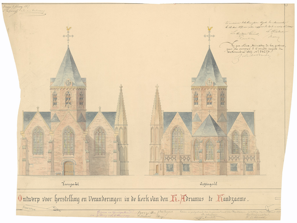 Opschrift: Ontwerp voor herstelling en veranderingen in de kerk van den H. Adrianus te Handzaeme. Omschrijving plan: opstand voorgevel en achtergevel Datum KCML: 13/05/1887 Archiefnummer: W0990