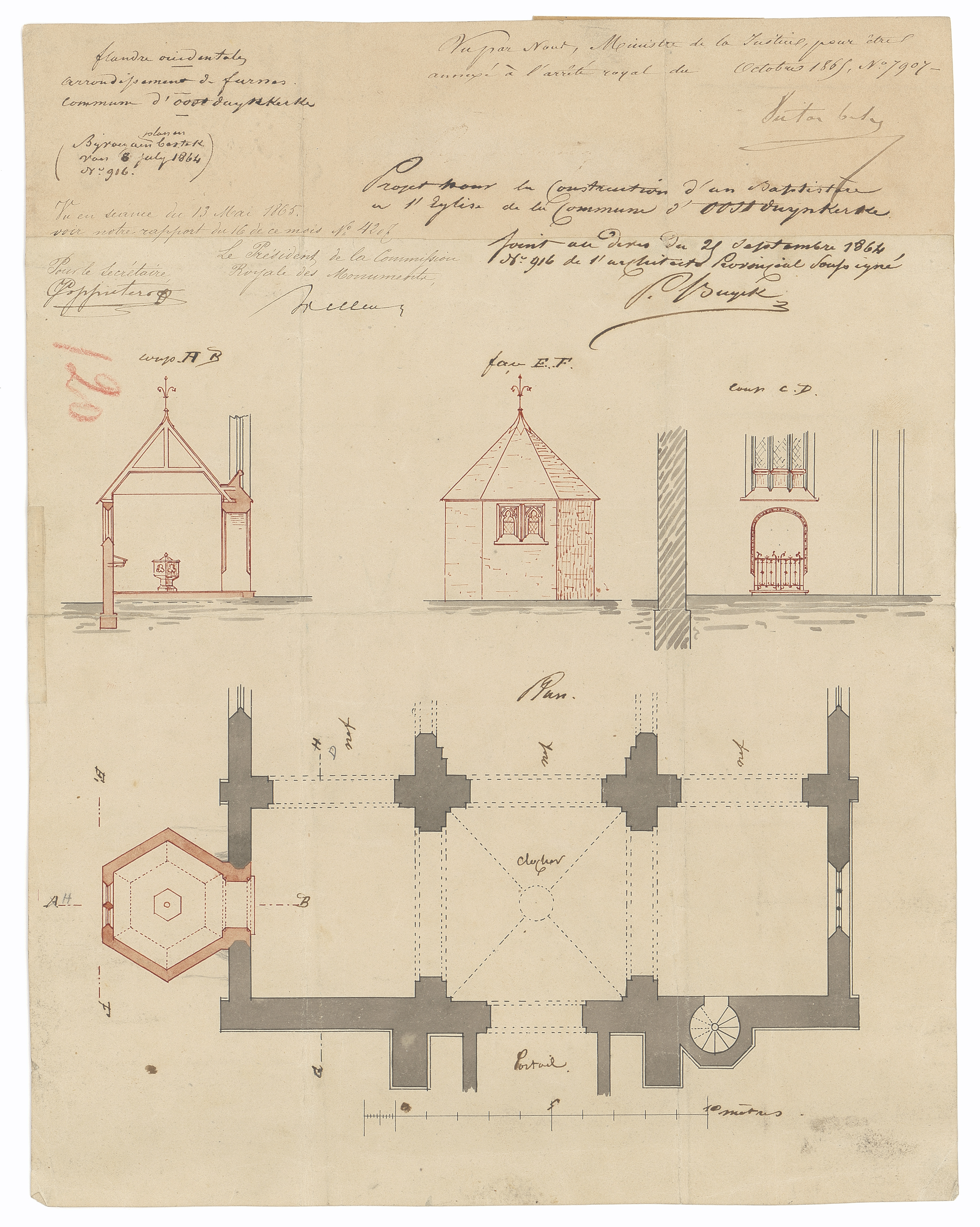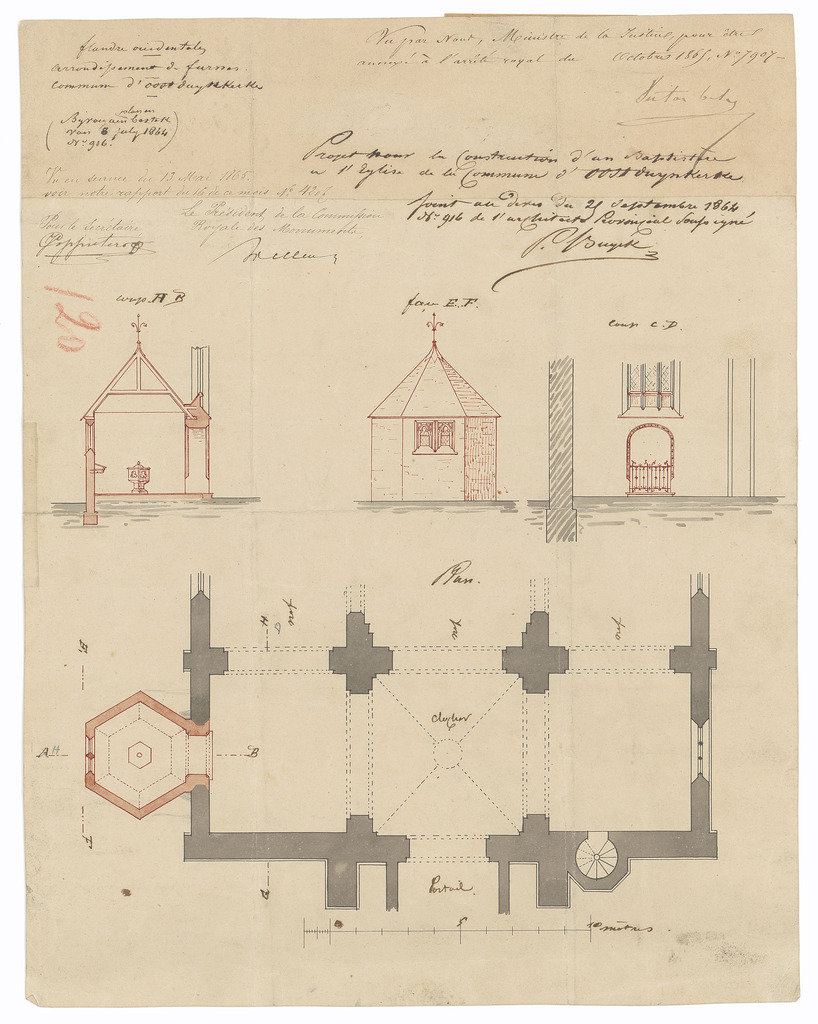Opschrift: Flandre Occidentale. Arrondissement de Furnes. Commune d'Oostduynkerke. Omschrijving plan: ontwerp doopkapel Datum KCML: 13/05/1865 Archiefnummer: W0954