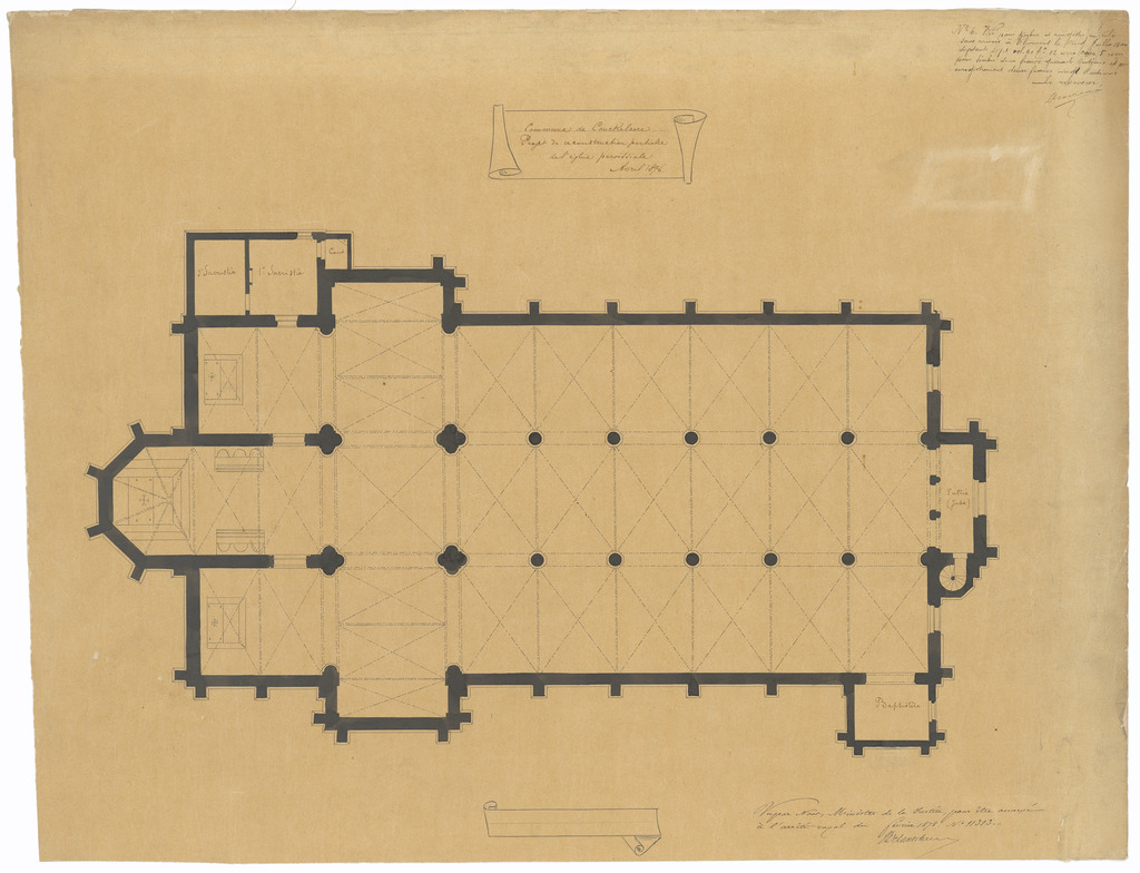 Opschrift: Commune de Couckelaere. Projet de reconstruction partielle de l'Eglise paroissiale. Omschrijving plan: plattegrond niveau 0 Datum KCML: deze informatie wordt niet vermeld op het archiefstuk Archiefnummer: W0919