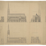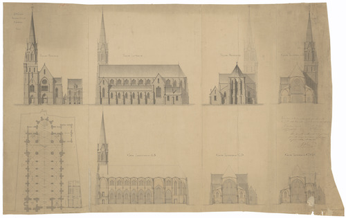 Opschrift: St. Eloy. Basse-Ville Courtrai Omschrijving plan: plattegrond, opstanden gevels, doorsneden Datum KCML: deze informatie wordt niet vermeld op het archiefstuk Archiefnummer: W1016 Ontwerper: mogelijks De Rym, voornaam onbekend