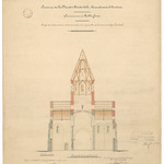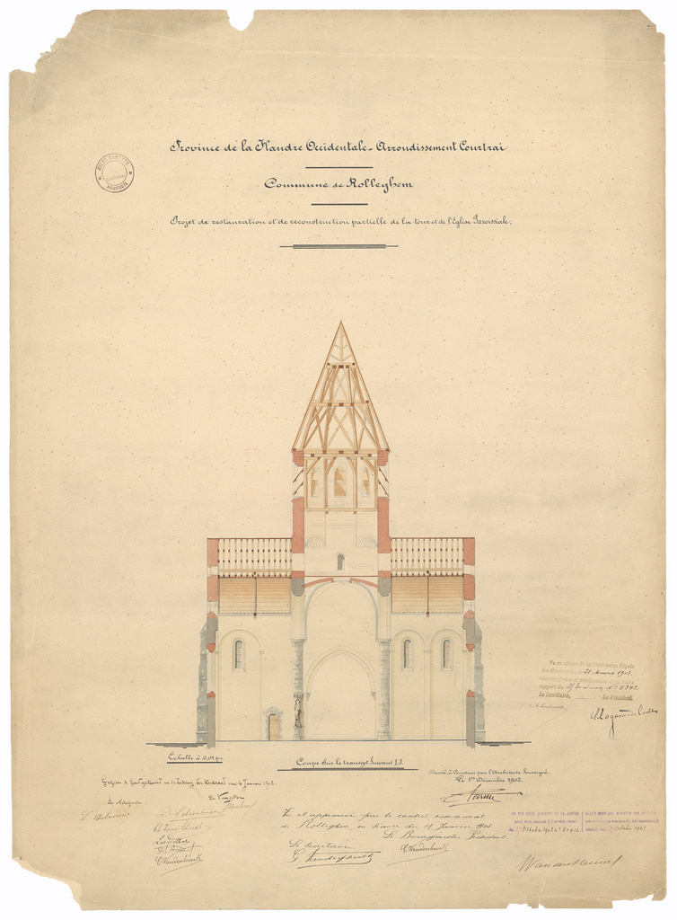 Opschrift: Province de la Flandre Occidentale - Arrondissement Courtrai. Commune de Rolleghem. Projet de restauration et de reconstruction partielle de la tour et de l'Eglise Paroissiale. Omschrijving plan: dwarsdoorsnede Datum KCML: 21/03/1903 Archiefnummer: W1079