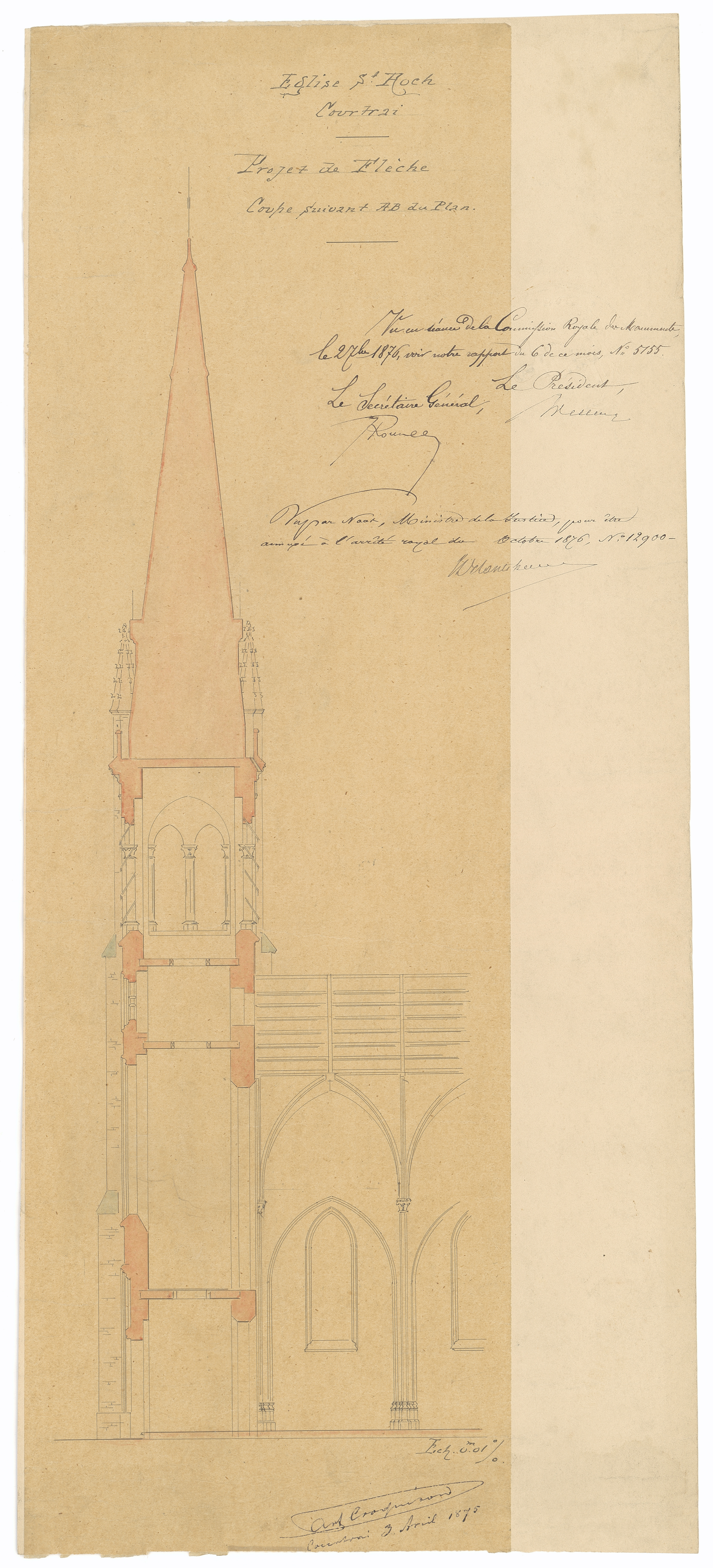 Opschrift: Eglise St. Roch Courtrai. Projet de Flèche Omschrijving plan: langsdoorsnede Datum KCML: 02/09/1876 Archiefnummer: W1047