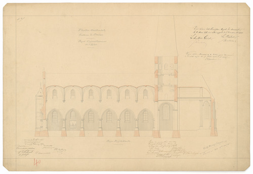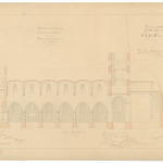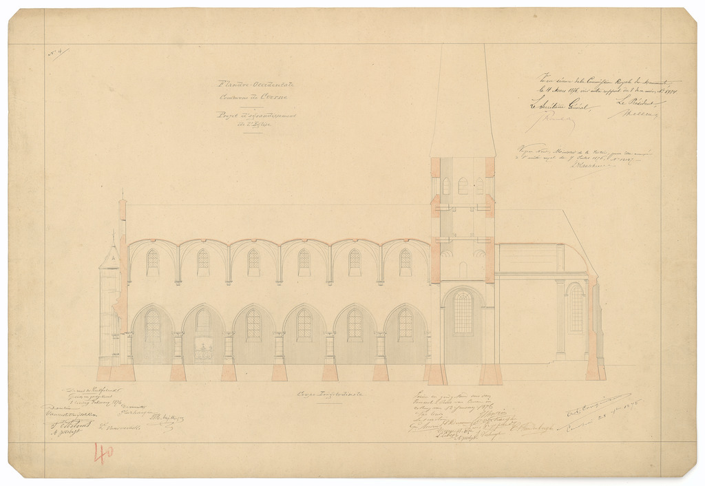 Opschrift: Flandre Occidentale. Commune de Cuerne. Projet d'agrandissement de l'Eglise. Omschrijving plan: langsdoorsnede Datum KCML: 04/03/1876 Archiefnummer: W1092