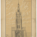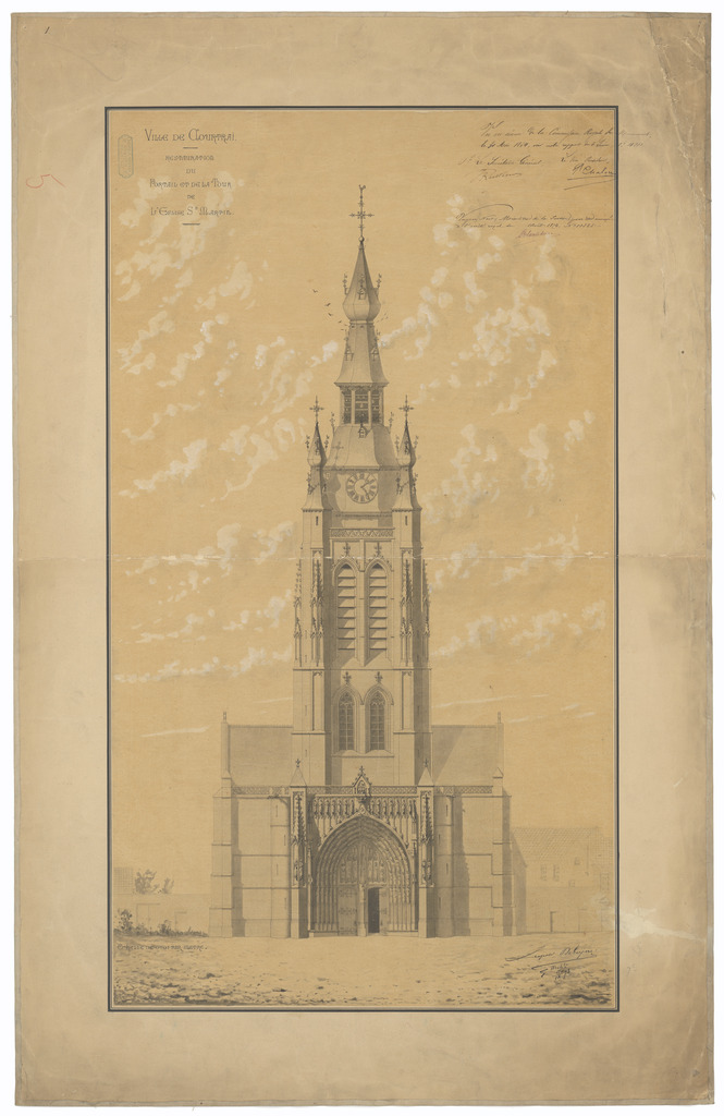 Opschrift: Ville de Courtrai. Restauration du Portail et de la Tour de l'Eglise St. Martin Omschrijving plan: opstand voorgevel Datum KCML: 30/05/1874 Archiefnummer: W1031
