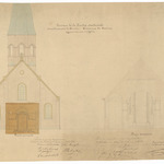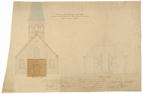 Opschrift: Province de la flandre occidentale. Arrondissement de Courtrai. Commune de Cuerne. Agrandissement de l'Eglise Omschrijving plan: opstand voorgevel en dwarsdoorsnede Datum KCML: deze informatie wordt niet vermeld op het archiefstuk Archiefnummer: W1087