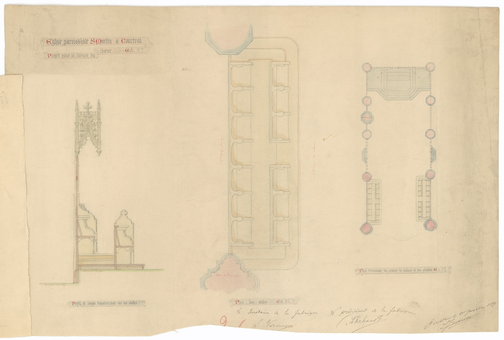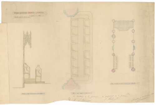 Opschrift: Eglise paroissiale de St. Martin à Courtrai. Projet pour la cloture du choeur Omschrijving plan: ontwerp koorgestoelte Datum KCML: 12/12/1891 Archiefnummer: W1041_02