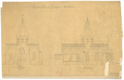 Opschrift: Parochiale kerk van Wercken. West-Vlaanderen Omschrijving plan: opstand voorgevel en zuidelijke zijgevel Datum KCML: deze informatie wordt niet vermeld op het archiefstuk Archiefnummer: W1004