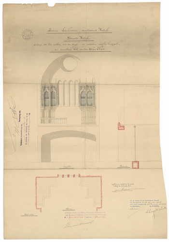 Opschrift: Provincie Westvlaanderen - Arrondissement Kortrijk. Gemeente Kortrijk. Ontwerp tot het maken van een orgel en versterken van het hoogzaal der parochiale kerk van de Heiligen Eligius Omschrijving plan: ontwerp orgel en versterken hoogzaal Datum KCML: 19/11/1904 Archiefnummer: W1017