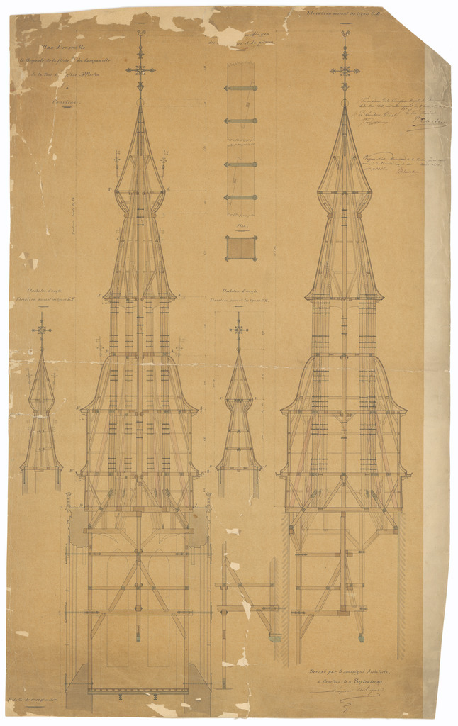Opschrift: Plan d'ensemble de la charpente de la flèche du Campanille de la Tour de l'Eglise St. Martin à Courtrai Omschrijving plan: ontwerp torenspits en klokketorentje Datum KCML: 30/05/1874 Archiefnummer: W1032