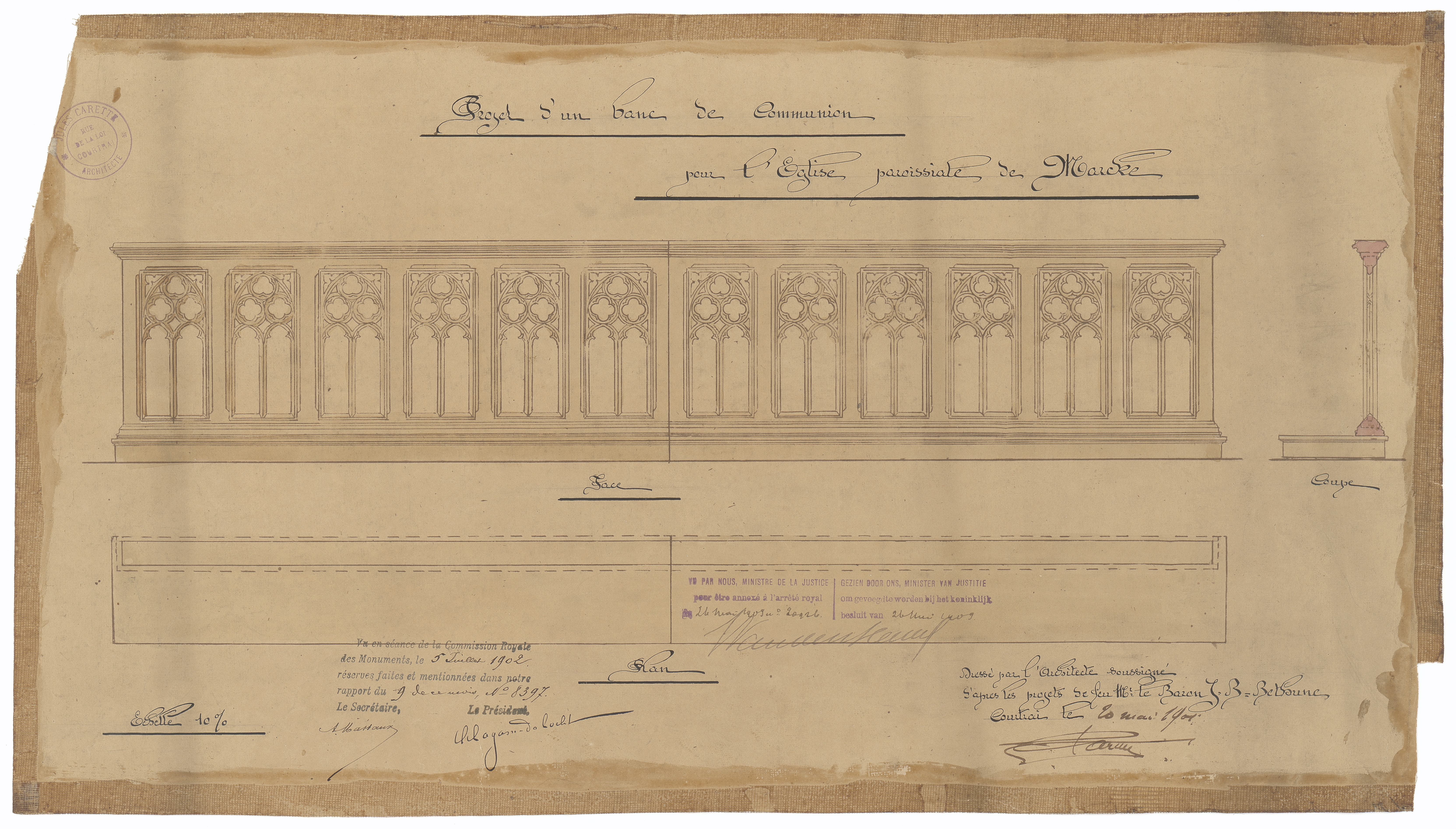 Opschrift: Projet d'un banc de communion pour l'Eglise paroissiale de Marcke. Omschrijving plan: ontwerp communiebank Datum KCML: 5-7-1902 Archiefnummer: W1067