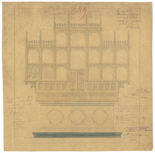 Opschrift: Parochie Kerk te Handzaeme. Ontwerp van een zijautaar toegewijd aan de XV Mysterien Omschrijving plan: ontwerp zijaltaar XV Mysteriën Datum KCML: 26/09/1891 Archiefnummer: W1001