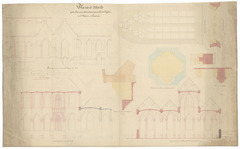 Opschrift: Plans et détails pour la réconstruction partielle de l'Eglise de St. Martin à Courtrai Omschrijving plan: opstand zijgevel, langs- en dwarsdoorsnede en detailtekeningen Datum KCML: 19/07/1865 Archiefnummer: W1029